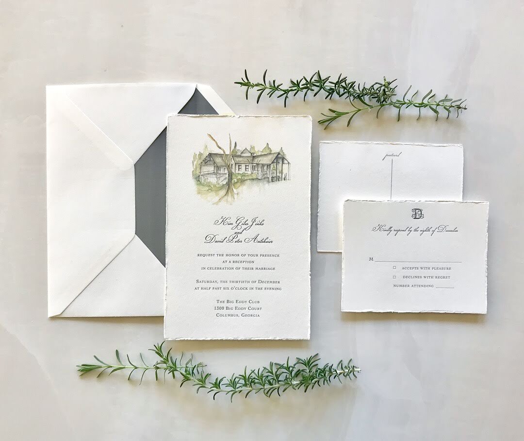 Kim and David were married just before New Year’s Eve in a cozy ceremony at the Big Eddy Club in Columbus, Georgia. Their wedding invitations incorporated both watercolor and letterpress elements, with a soft, deckled edge detailing.